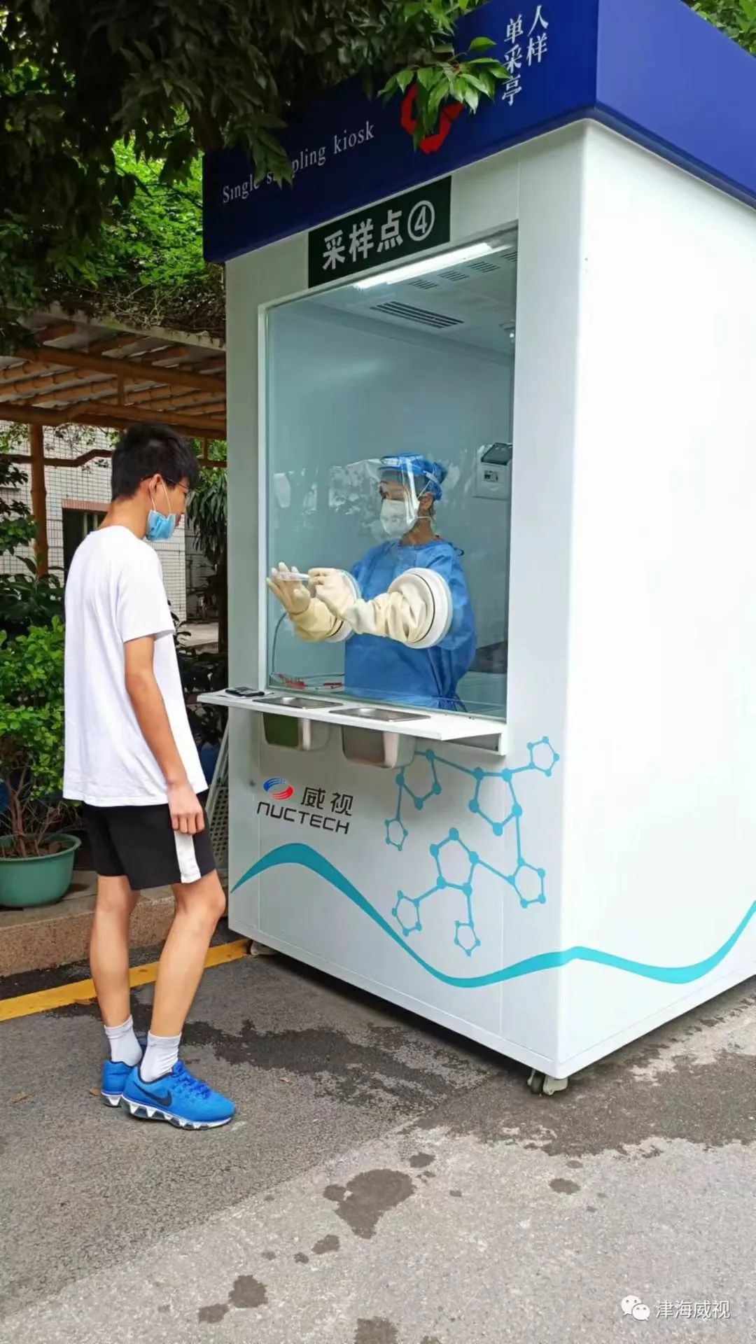 采样工作站小小的白色亭子,只有数平方米,却内有乾坤。移动式采样工作站的设计便捷高效,采样工作可做到医患分离,双侧单采,配备密封手套,有效控制采样距离。同时,配备信息录入窗口,医护可从舱内传递拭子及采样管,减少医护人员数量配备。室内正压环境保证气流流向安全,工作站舱内配备UV紫外线消毒灯,医护人员无需穿防护衣,采样工作完成后即时消毒。