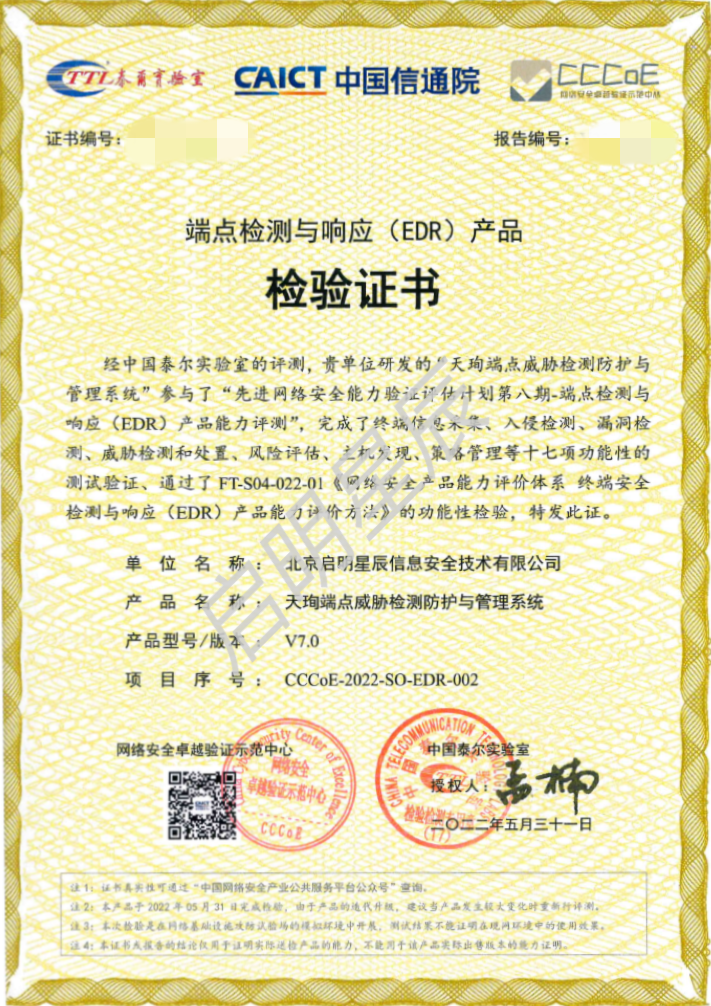 近日,在中国信通院组织的“先进网络安全能力验证评估计划”活动中,启明星辰端点检测与响应(EDR)通过了产品能力评测,获得端点检测与响应(EDR)产品检验证书。