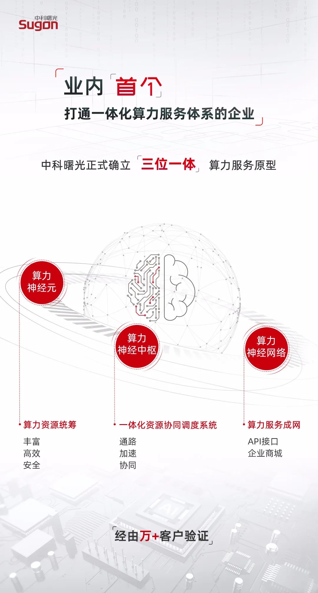 算力神经元,即丰富、高效、安全、绿色的算力资源,如同大脑构造中,负责存储电信号的百亿神经元。基于曙光20余年的计算领域技术深耕,加以持续管理运营算力资源的经验沉淀,为实现一体化算力服务建立基础。