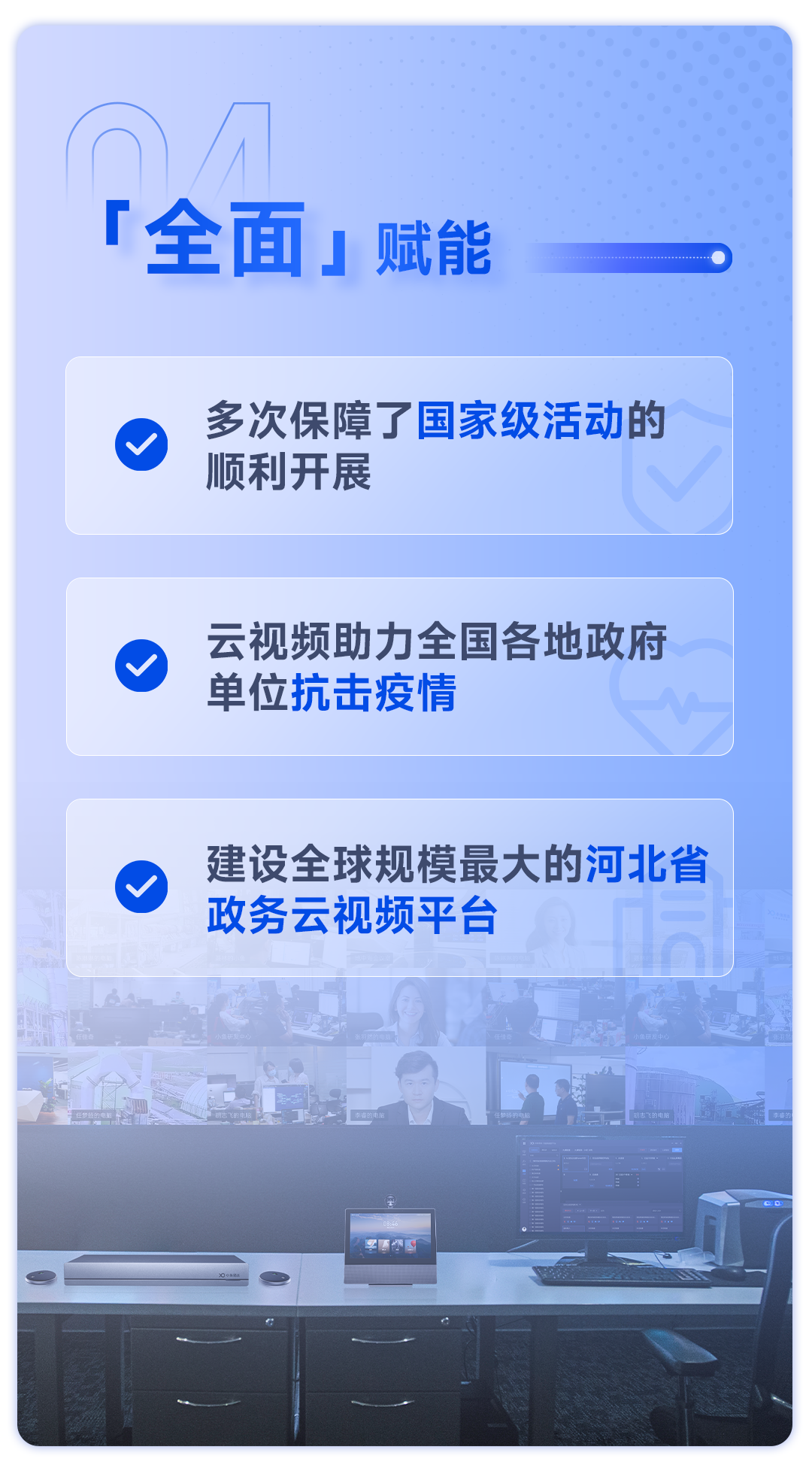 50多家部委和央企、300多家省市厅局、16万家大中型客户,选择小鱼易连进行数字化转型,发力数字经济和抗疫战疫。
