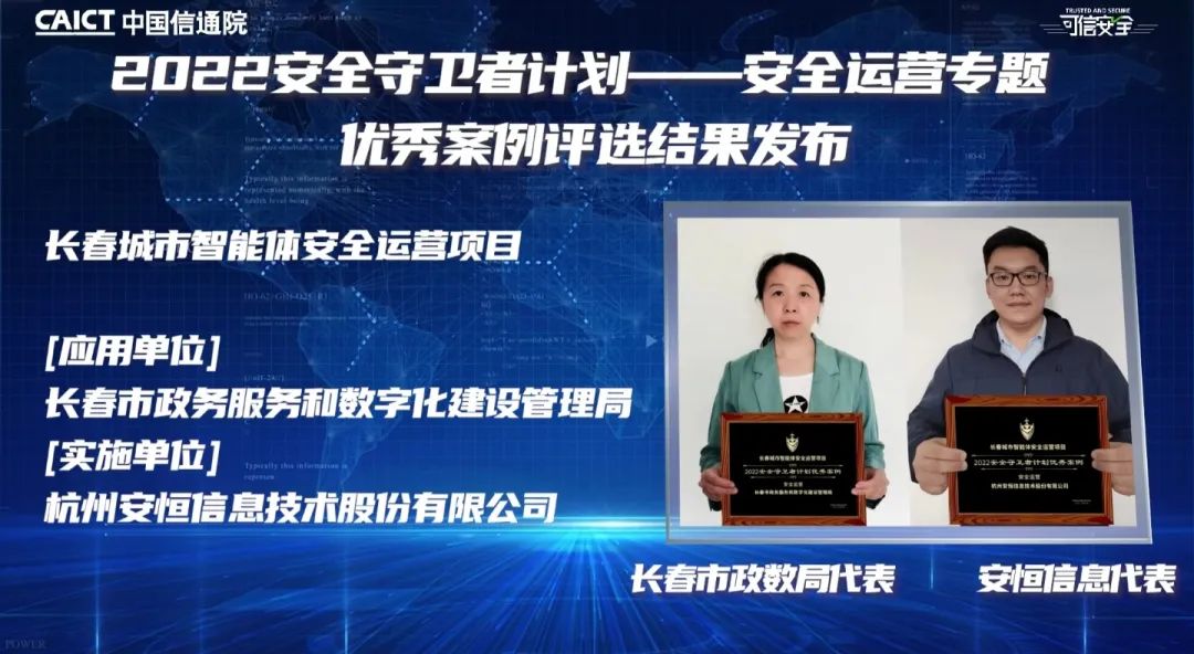 6月10日,中国信息通信研究院(以下简称“中国信通院”)主办的“安全运营发展论坛”在北京顺利举办,会上正式发布2022安全守卫者计划——安全运营专题优秀案例评选结果,安恒信息作为实施单位开展的【长春城市智能体安全运营项目】成功入选!