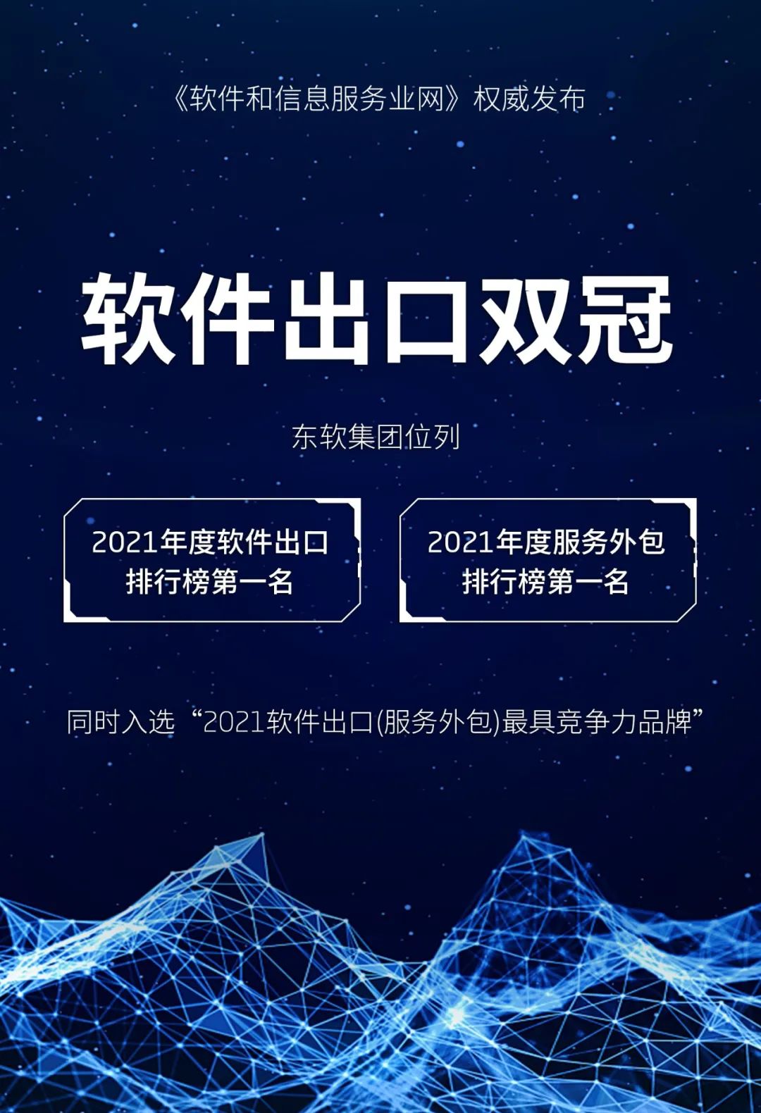 据《软件和信息服务业网》近日发布的软件出口和服务外包榜单,东软集团获得“2021年度软件出口排行榜”和“2021年度服务外包排行榜”双项第一,同时入选“2021软件出口(服务外包)最具竞争力品牌”,东软集团副总裁兼商用软件事业部总经理钱树森荣获“2021软件出口(服务外包)年度领袖人物”。