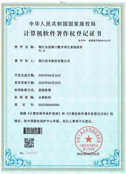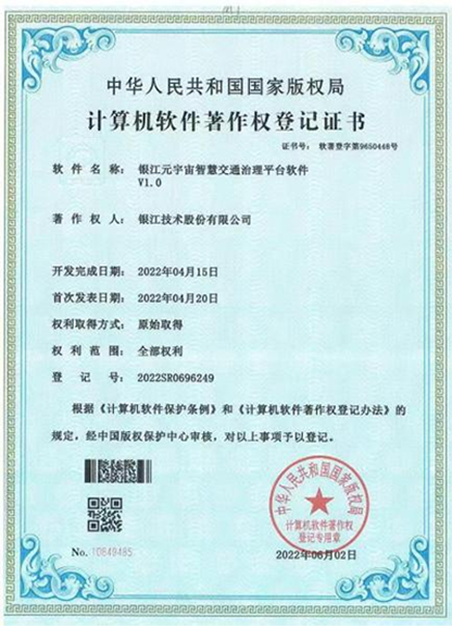 近期,公司自主研发的银江元宇宙智慧交通治理平台软件V1.0、银江全息路口数字孪生系统软件V1.0获得国家版权局颁发的软著证书。这标志着银江在虚拟现实、数字孪生等领域的创新与应用能力再次取得成果,为公司赋能数字化未来再添助力!