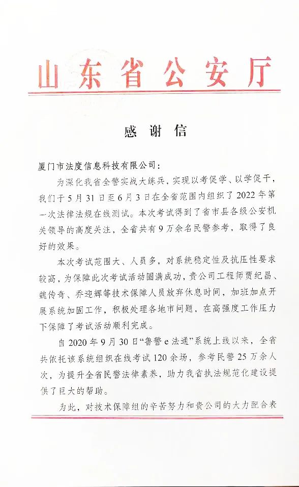 近期,山东省为深化全警实战大练兵,实现以考促学、以学促干,在全省范围内组织了一次法律法规在线测试,全省9万多名民警参加测试,取得了良好的效果。法度信息相关人员应急响应及时,措施保障得力,在高强度工作压力下保障考试活动顺利完成,山东省公安厅为此发来感谢信。