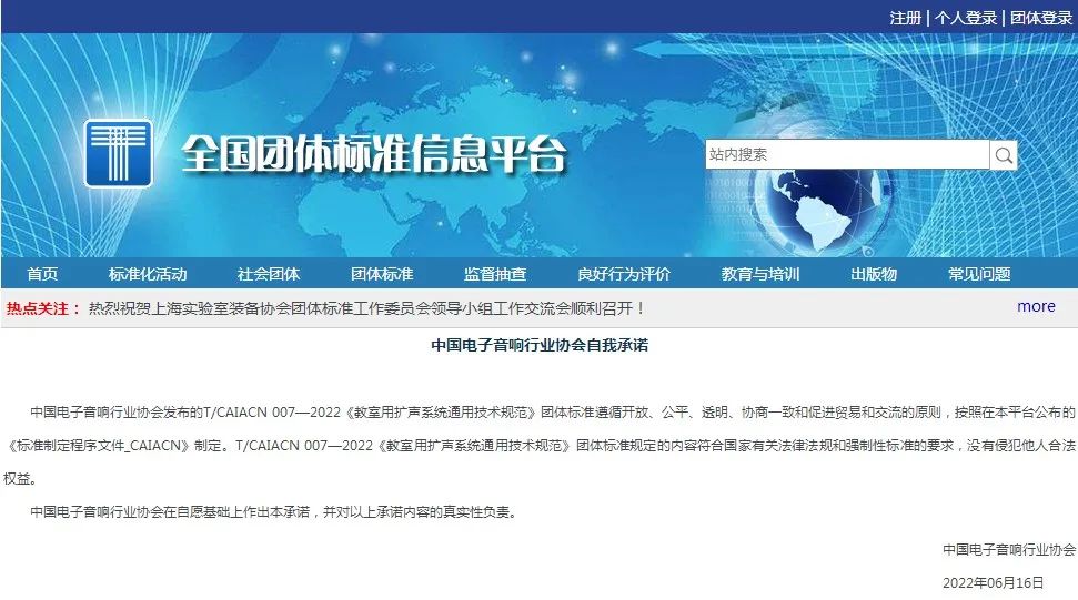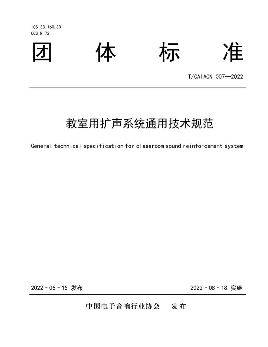 2021年itc参与起草T/CAIACN 007—2022《教室用扩声系统通用技术规范》团体标准,于2022年6月15日正式发布,2022年08月18日起正式实施。该团体标准对教室用扩声系统产品的研发、生产、制造、应用有着清晰的指导作用,对产业发展具有积极的意义。《教室用扩声系统通用技术规范》团体标准的制定及应用,将有助于学校教室声音环境的改善,提高教学的语音声压均匀度和语音清晰度,对教育教学质量的提升有重要的意义。