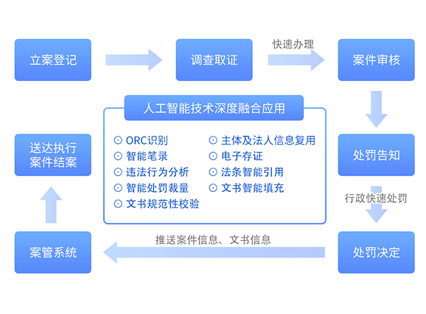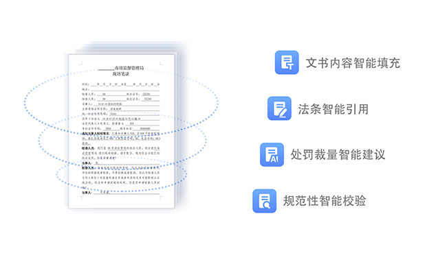 系统通过证照OCR识别技术及数据复用实现案件基本信息的快速录入;通过执法办案知识结构化技术开展违法行为分析、法条引用、智能处罚裁量、文书快速填充和文书规范性校验;基于电子签章、电子存证等实现案件全流程电子化办理以及文书电子送达,法度简案速办系统让智慧监管“轻而易举”。