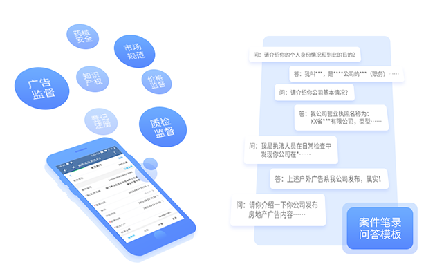 针对违法事实清楚、证据确凿,且情节简单、处罚轻微的常见违法事项预设100+常见案件笔录问答模板。现场调查阶段可通过预设模板快速生成笔录,解决问话要点错漏、重复等问题,节省工作量又保障笔录证据内容完整规范。