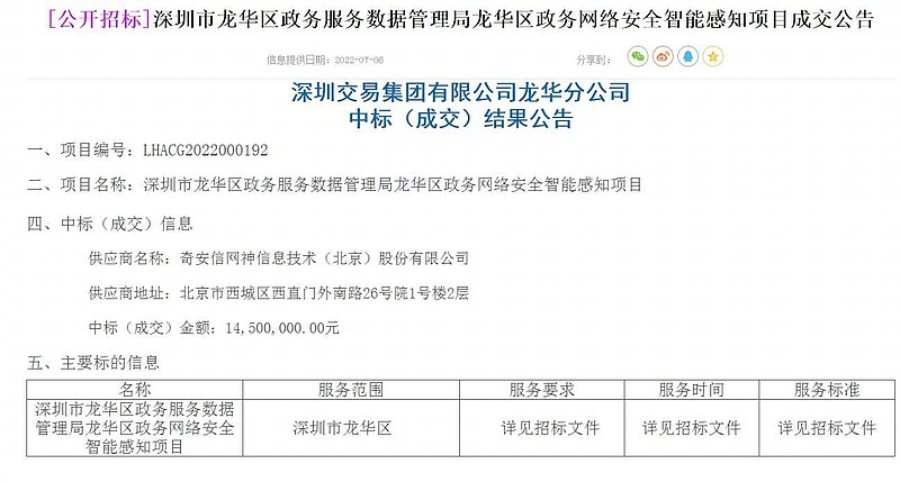近日,深圳交易集团有限公司龙华分公司发布公告显示,奇安信网神信息技术(北京)股份有限公司独家中标深圳市龙华区政务服务数据管理局龙华区政务网络安全智能感知项目,中标金额1450万。