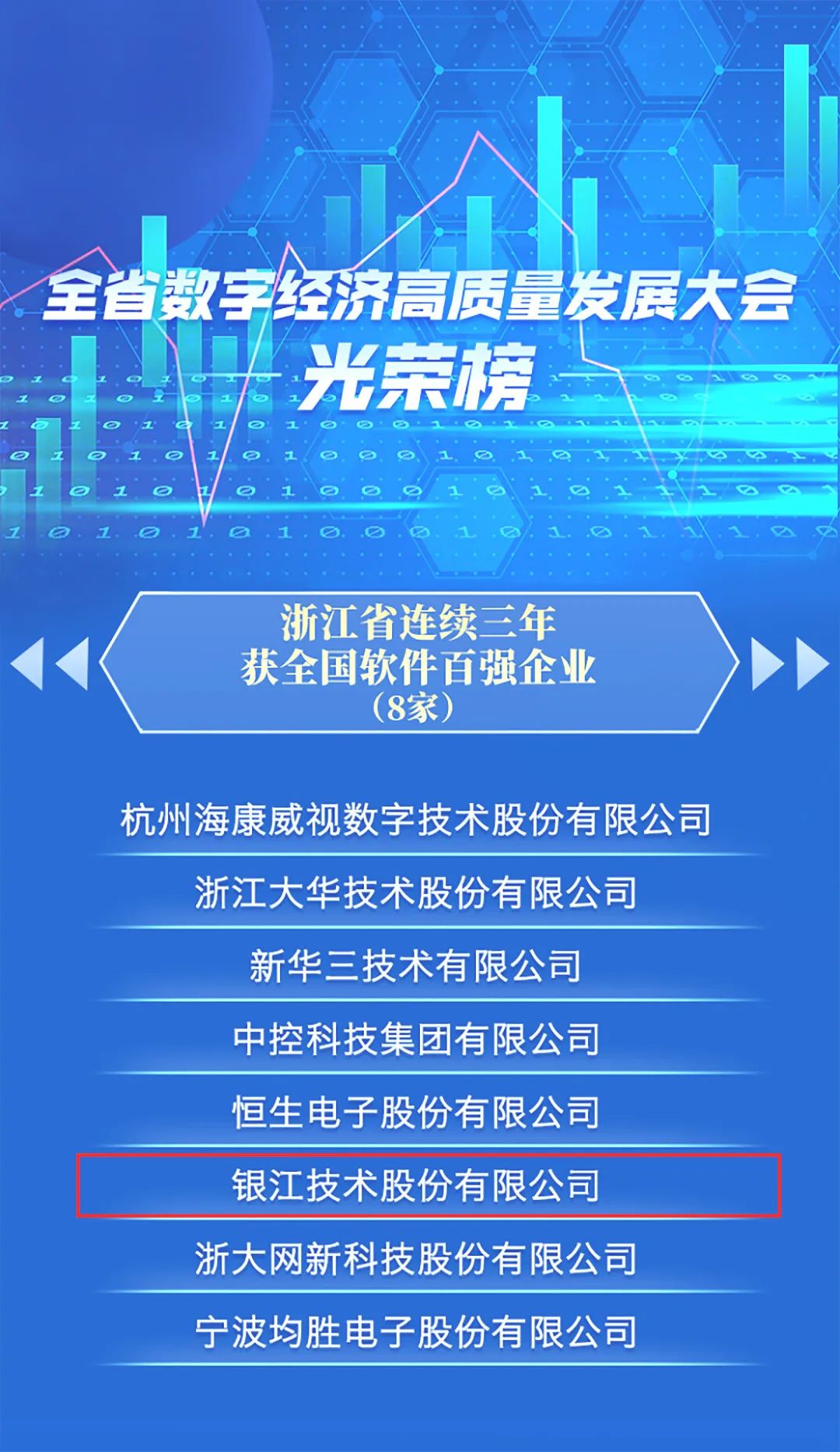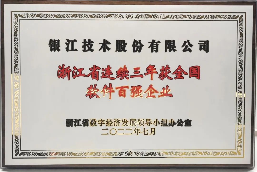 随后,大会宣读了全省推动数字经济发展的18项319家先进企业名单。银江技术荣膺“浙江省连续三年获全国软件百强企业”荣誉称号,在现场接受了浙江省委常委、秘书长陈奕君授牌。