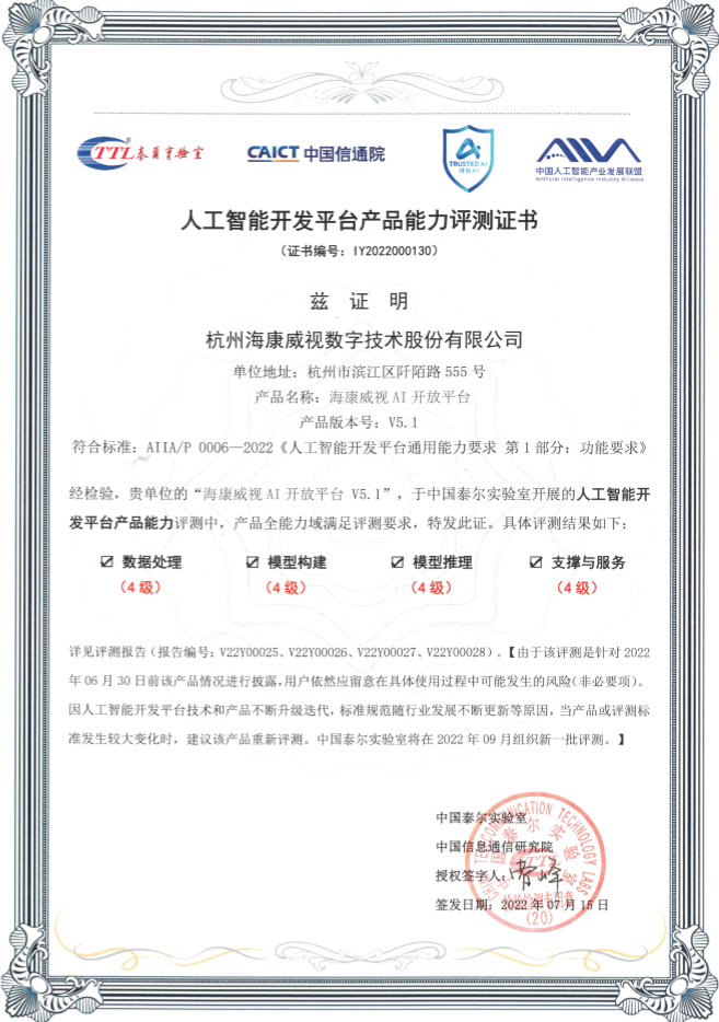 近日,在中国信息通信研究院(以下简称“中国信通院”)2022年组织的“可信 AI”评测中,海康威视AI 开放平台通过“人工智能开发平台产品能力” 4级评测(领先级),产品全能力域(数据处理、模型构建、模型推理、支撑与服务)均达到4级标准。