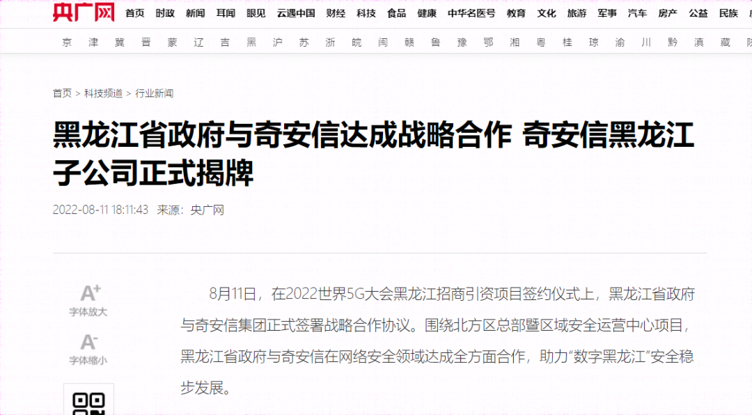 8月11日,在2022世界5G大会黑龙江招商引资项目签约仪式上,黑龙江省政府与奇安信集团正式签署战略合作协议。围绕北方区总部暨区域安全运营中心项目,黑龙江省政府与奇安信在网络安全领域达成全方面合作,助力“数字黑龙江”安全稳步发展。