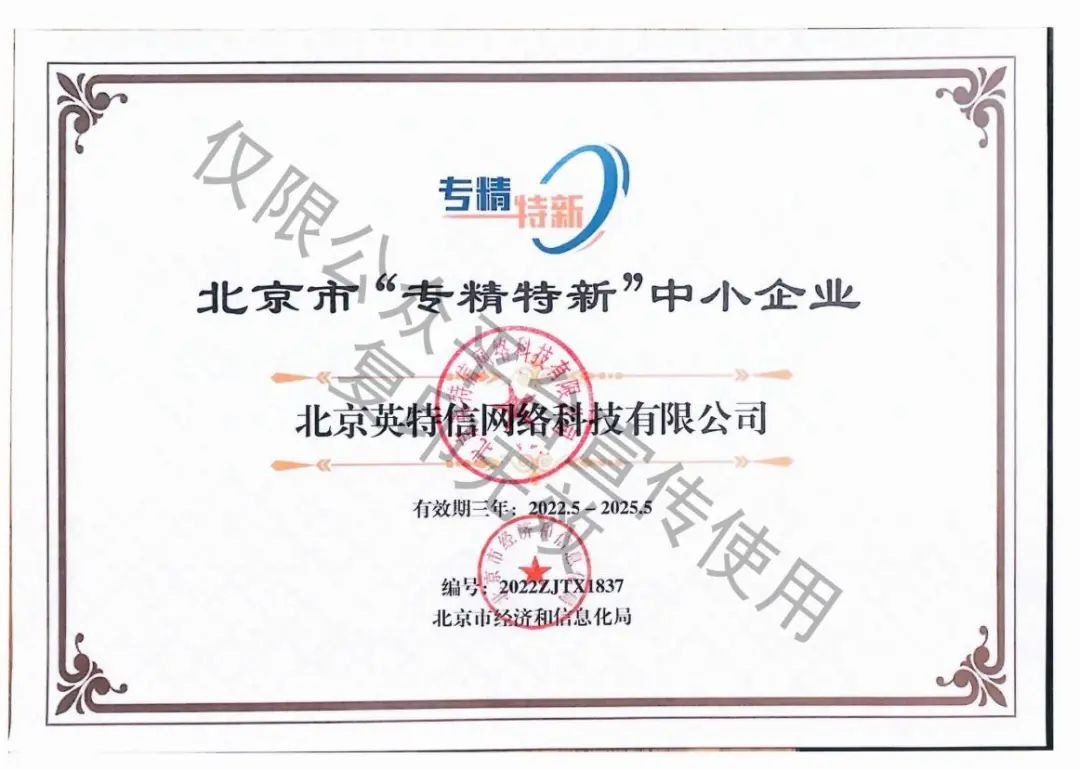 近期,北京英特信网络科技有限公司(旗下有派美雅和信刻两个国产品牌)荣获北京市2022年度“专精特新”中小企业荣誉证书。此次荣获认证,代表了北京市经济和信息化局对公司技术水平、产品质量、研发实力、创新能力、行业地位及品牌影响力等方面的肯定与认可。“专精特新”是国家为引导中小企业走上“专业化、精细化、特色化、新颖化”发展之路,增强自主创新能力和核心竞争力、不断提高发展质量和水平而实施的重大工程。