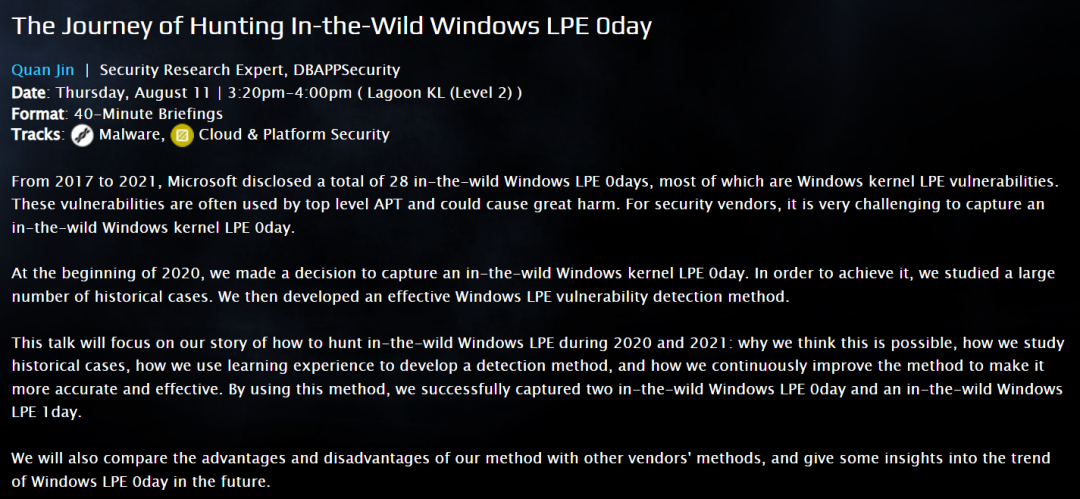 安恒信息在议题中阐述到,“对于安全厂商和威胁狩猎人员来说,捕获在野0day漏洞是一个非常有挑战性的事情,我们基于过去多年历史技术案例复盘研究,并提出一套有效的Windows本地提权漏洞的检测方法,目前利用该方法多次捕获到Windows在野0day漏洞。此外通过对比不同方法的优劣势,给出我们对未来Windows本地提权漏洞的一些洞见。”