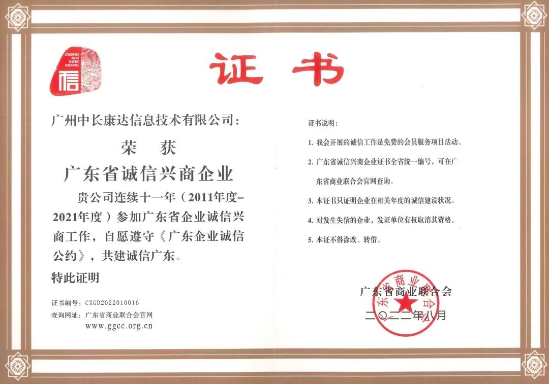 近日,广东省商业联合会公布了2021年度“广东省诚信兴商企业”名单,中长康达凭借良好的企业信誉,连续十一年获奖。