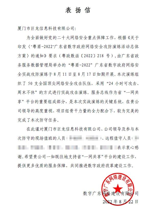 近日,巨龙信息收到数字广东网络建设有限公司(数字广东)发来的感谢信。信中数字广东对巨龙信息项目组团队全力配合完成广东省数字政府网络安全实战攻防演练保障任务,在工作中的担当和贡献表示由衷感谢。