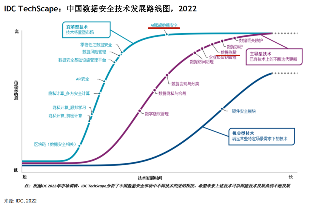 8月26日,在IDC2022 CSO全球网络安全峰会(中国站)上,IDC重磅发布《IDC TechScape:中国数据安全发展路线图,2022》,根据技术的市场影响以及各技术的发展阶段将技术分为变革型技术、主导型技术以及机会型技术三大类别,安恒信息成功入选“变革型”技术曲线“AI赋能数据安全”技术推荐厂商和“主导型”技术曲线“数据脱敏”技术推荐厂商,彰显安恒信息在数据安全新技术研究领域的杰出成果。报告认为,帮助用户构建全方位数据安全治理体系将成为大趋势,各项数据安全和密码技术将在治理体系中作为重点能力模块,赋能用户实现数据安全治理目标。