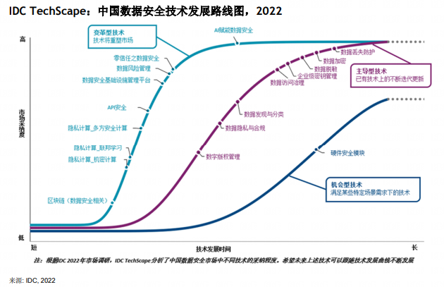 IDC将数据安全市场分为敏感数据管理、数据隐私与合规、加密与相关技术、密钥管理、证书管理和其他数据安全产品这六个子市场,本次研究对于每个数据安全领域单项技术的部署情况、风险程度、市场热度等内容进行了细致的研究,从而为最终用户在产品选型时提供技术参考。