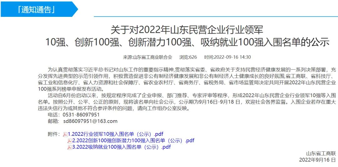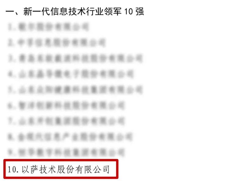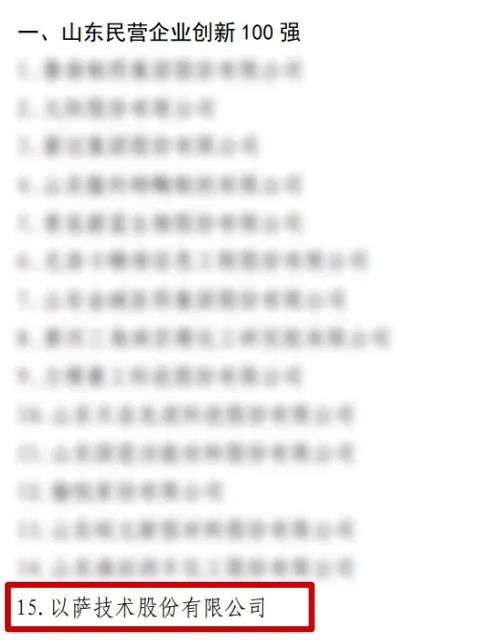 近日,省工商联公布了2022年山东民营企业100强系列榜单,以萨技术荣登双榜!成功入围行业领军10强名单和创新100强名单。
