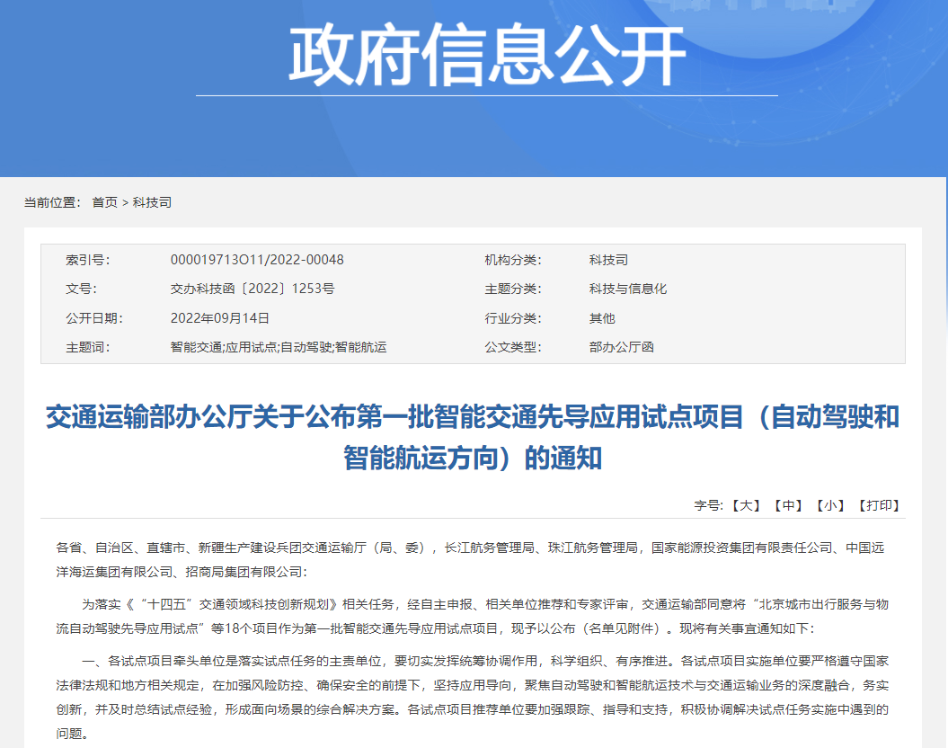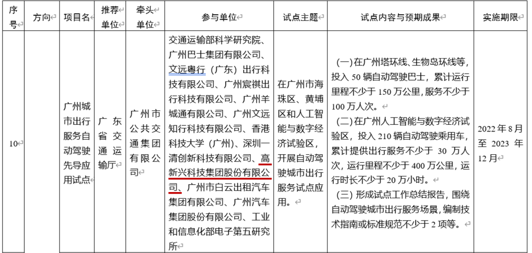 9月14日,交通运输部公布了第一批共18个智能交通先导应用试点项目(自动驾驶和智能航运方向)的通知。高新兴科技集团参与的“广州城市出行服务自动驾驶先导应用试点”入选交通运输部第一批智能交通先导应用试点项目。