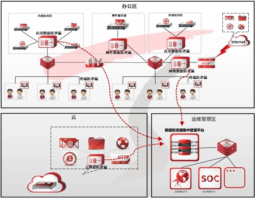 该方案采用先进的技术和手段,包括数据自动分类分级、深度内容识别、动态数据指纹、机器聚类、用户异常行为分析等,实现互联网、私有网络、终端等多种环境下结构化和非结构化的数据泄漏防护和风险分析。同时,用于方案落地的产品体系包括数据分类分级、网络数据防泄漏、邮件数据防泄漏、应用数据防泄漏、云数据防泄漏、终端数据防泄漏等,实现对办公区、邮件区、应用区等逻辑域的数据监测,发现数据泄漏风险行为。