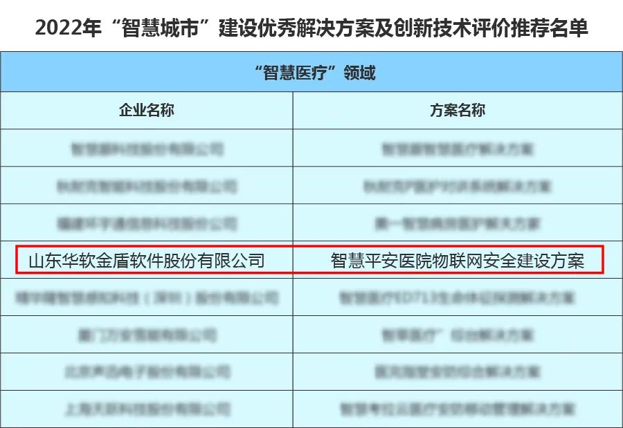 近日,由中国安防协会主办的2022年“智慧城市”建设优秀解决方案及创新技术评价推荐发布评选结果。金盾软件凭借在智慧医疗领域构建的智慧平安医院物联网安全建设方案,实力入选推荐榜单并获得奖项。