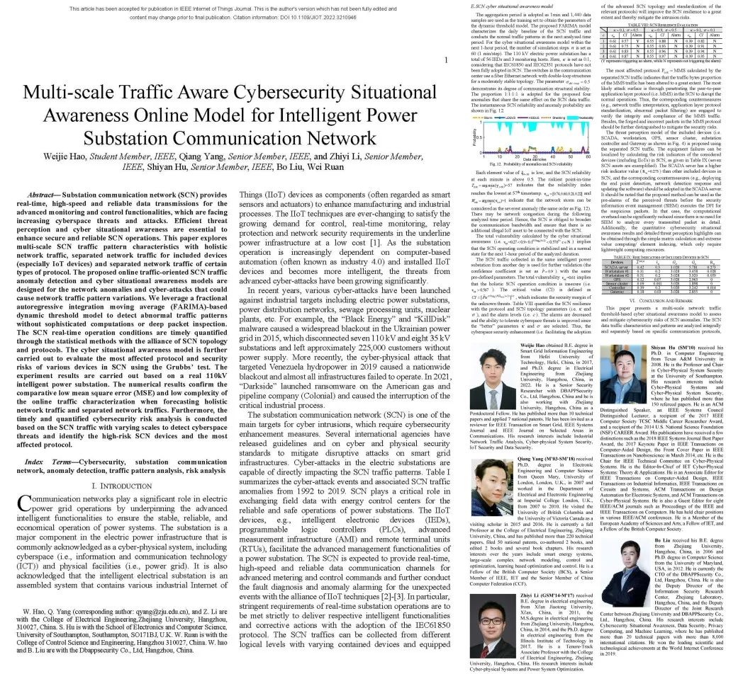 近日,由安恒信息“AiLPHA大数据实验室”郝唯杰博士主导的针对工业互联网典型场景(智能变电站通信网络)的网络安全态势感知在线架构“Multi-scale Traffic Aware Cybersecurity Situational Awareness Online Model for Intelligent Power Substation Communication Network”,被物联网领域国际顶级学术期刊《IEEE Internet of Things Journal》收录并在线发表。