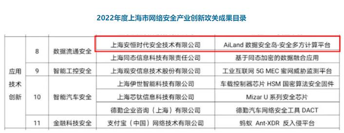 近日,上海市经济信息化委员会公布“2022年度上海市网络安全产业创新攻关成果目录”,共评定出基础技术创新、应用技术创新、服务业态创新三大类别创新攻关成果,安恒信息AiLand数据安全岛-安全多方计算平台成功入选应用技术创新类别,充分彰显安恒信息在数据流通安全领域的技术实力和市场认可。