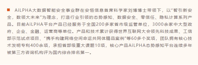 当前,全球正处于数字化转型升级的关键节点,中国作为数字技术应用的先锋,数据要素已经成为经济高质量发展的核心驱动力,随之而来的安全问题也日益凸显。秉承“构建安全可信的数字世界”的企业使命,安恒信息将持续助力构建服务于城市数字化转型的新型数字信任体系,进一步保障数据应用安全,提高重要数据安全保护水平。在我国数字经济发展中发挥积极作用,服务于国家、社会在数字时代的高质量发展和安全。