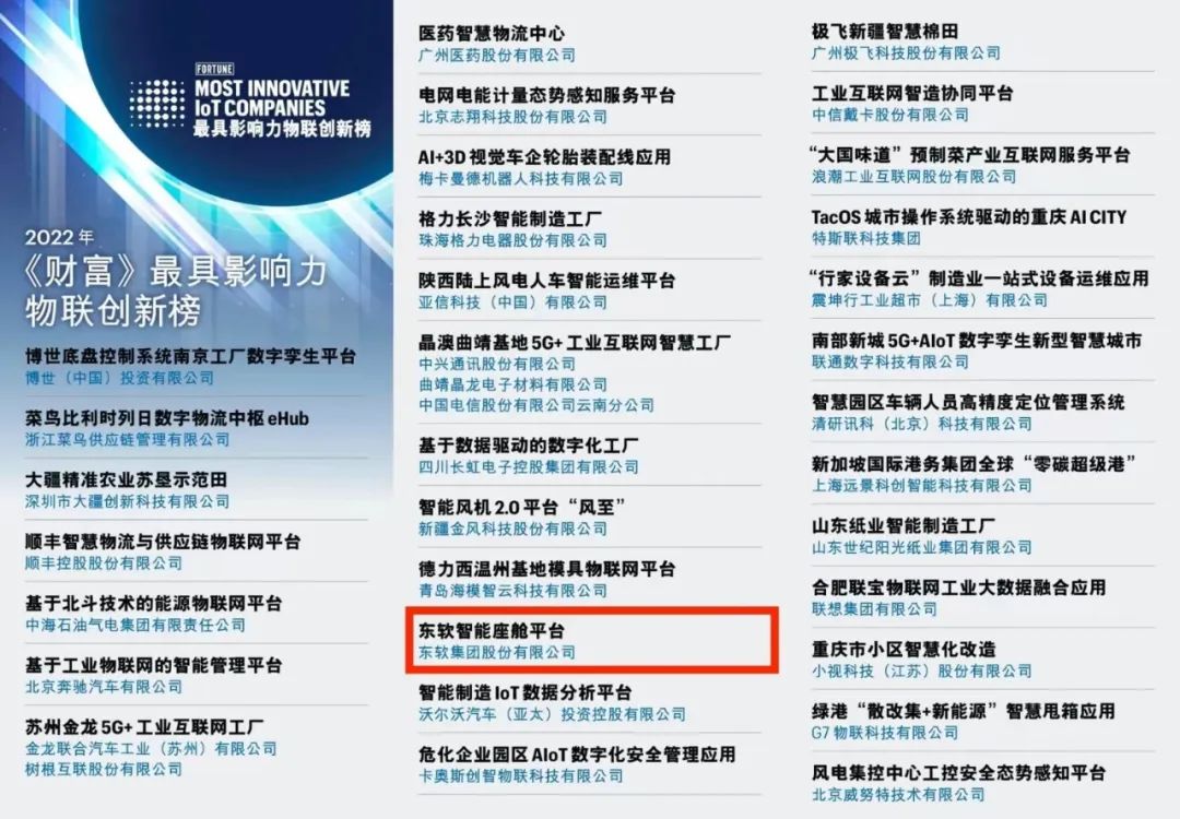 近日,《财富》杂志发布2022年最具影响力物联创新榜,东软智能座舱平台凭借卓越的产品特性和智能化的用户体验,成为物联网创新案例。