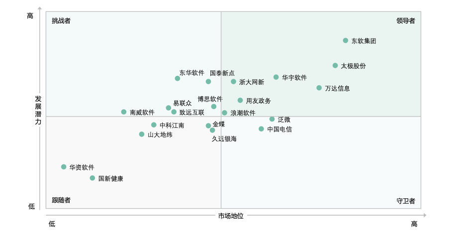 报告梳理了数字政府经济调节、市场监管、社会治理、公共服务、生态保护、政务运行六大类应用场景,并从当前数字化建设进程较快、市场关注度较高的五个热点细分领域开展深入分析。 报告指出,东软在一体化政务、人社服务、医疗保障等细分领域,保持领军地位。