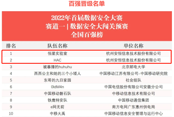 11月4日,由工业和信息化部网络安全管理局指导,中国电子信息产业发展研究院、中国信息通信研究院、国家工业信息安全发展研究中心、中国软件评测中心(工业和信息化部软件与集成电路促进中心)联合举办的“2022年首届数据安全大赛”赛道一(数据安全大闯关)预赛结果公布。安恒信息恒星实验室、HAC战队在两天的比赛中凭借扎实的理论基础和高效的团队协作,位居全国百强榜第一名和第二名,成功晋级决赛,彰显了安恒信息在数据安全领域领先的专业实力。期待他们在决赛中再创佳绩!
