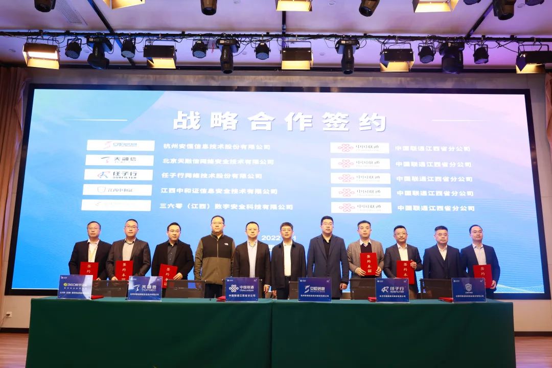 11月15日,中国联合网络通信有限公司江西省分公司(以下简称“江西联通”)与安恒信息等5家网络安全领域知名企业正式签署战略合作协议。江西联通副总经理李浩宇,工业互联网研究院院长万刚等联通领导,安恒信息副总裁卢小波,联通集团事业部总经理柯玮等出席签约仪式。