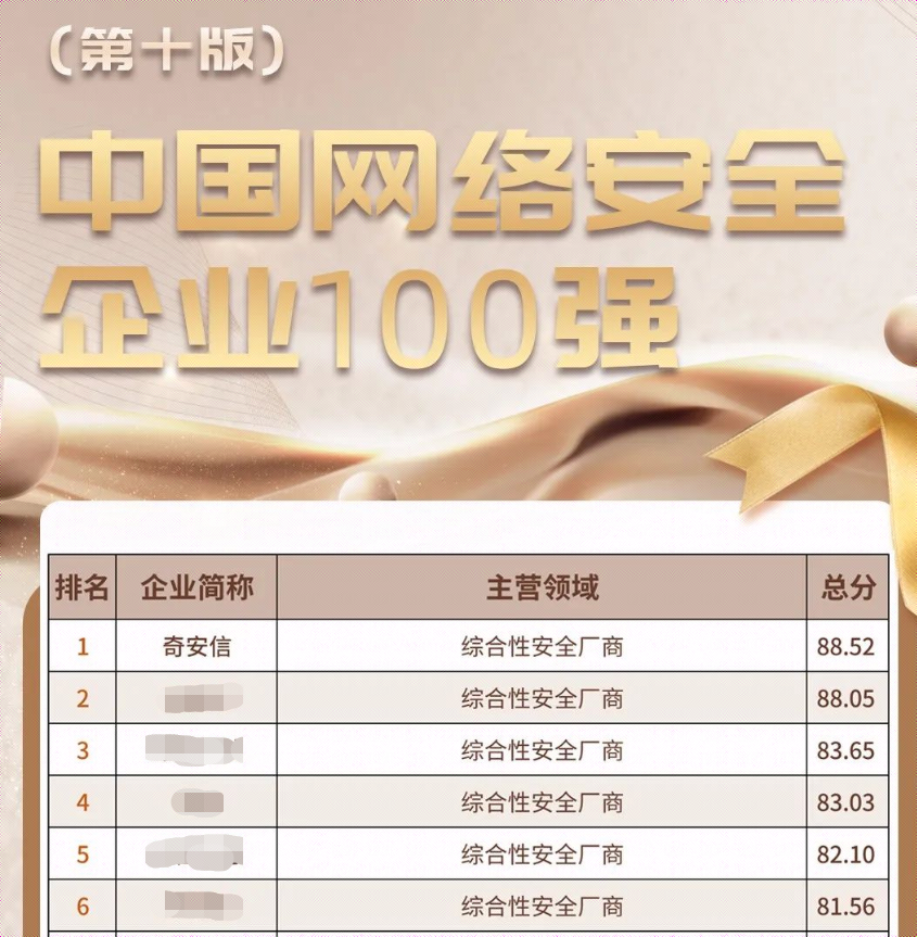 11月15日,国内网络安全媒体安全牛发布第十版《中国网络安全企业100强》。在申报的300余家安全厂商中,奇安信集团继去年之后,再次以88.52的总分荣登中国网络安全100强榜首,并在技术创新、行业应用等维度均位列第一,充分体现了网络安全龙头企业的整体竞争实力。