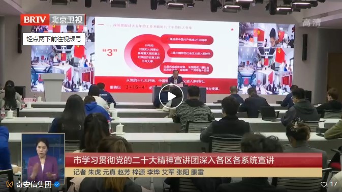 11月22日,北京市学习贯彻党的二十大精神宣讲团赴奇安信集团举行宣讲报告会。市宣讲团成员,市委网信办主任、市委互联网企业工委书记韩昱作报告,并与广大党员干部代表座谈交流。
