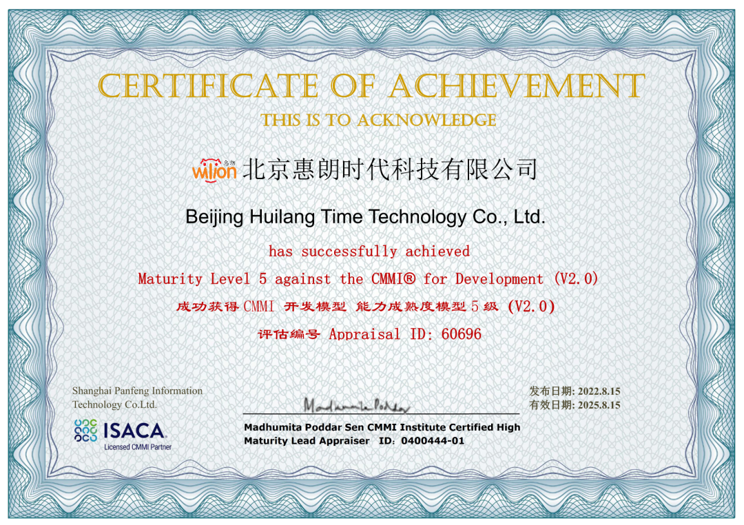 惠朗科技历经了预审、ATM培训考核、就绪检查等多轮环节,自2022年3月8日开始,接受了由美国卡耐基梅隆大学软件工程研究所(SEI)授权的主任评估师Madhumita Poddar Sen带领的评估小组所进行的为期半年的CMMI-5级正式评估考核。评估小组按照CMMI-5模型标准,对公司的印章云、智能用印系统、印章管理系统等5个项目的软件开发过程及运行情况进行了严格审查。评估小组在完成对应的证据确认后,一致认为惠朗科技的软件开发完全满足CMMI-5对应的目标与实践的要求。
