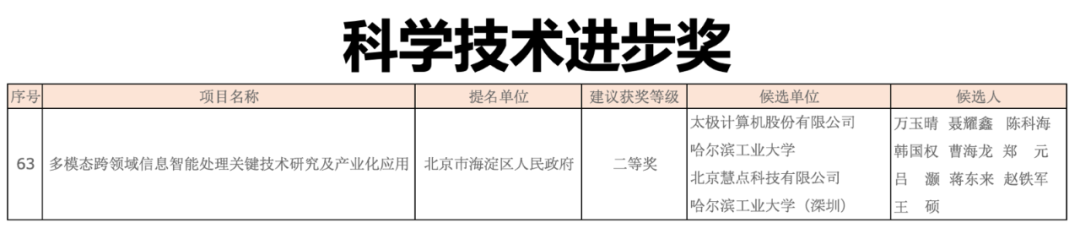 近日,北京市人民政府正式公布《关于2021年度北京市科学技术奖励的决定》(京政发〔2022〕33号)。由太极股份牵头,哈工大、慧点科技、哈工大(深圳)共同研发的《多模态跨领域信息智能处理关键技术研究及产业化应用》成果荣获2021年度北京市科学技术奖——科学技术进步二等奖。