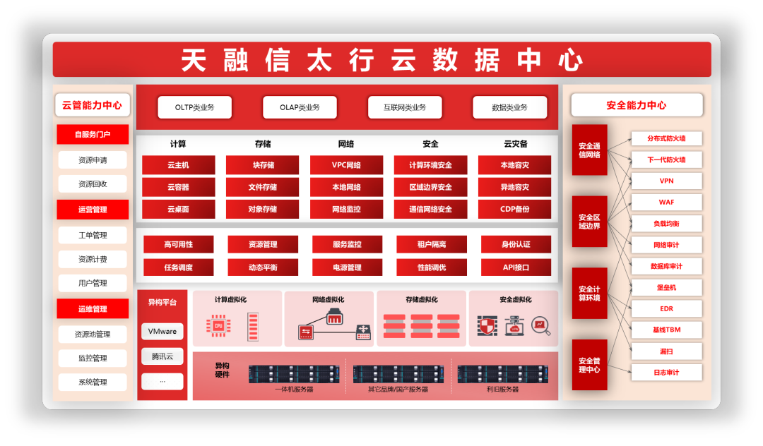 该项目中,基础云平台按照二级等级保护能力要求进行建设。通过资源池化,实现相关能力服务供给;通过云资源管理系统、虚拟化软件、控制系统和运维管理系统等,实现虚拟化资源的统一调度、性能监测和运维管理。对此,天融信科技集团高级副总裁毕学尧表示:天融信自布局云计算以来,始终秉持着做客户“值得信赖的云专家”的理念,在前沿技术中持续探索与实践。基于自身在网络安全领域27年的雄厚积累,天融信将自身安全基因与超融合平台深度融合,构建了“内生安全防护体系”的云平台,从平台层、主机层、数据层及应用层提供业务上线即安全的全面保障,实现云+安全一体化交付。