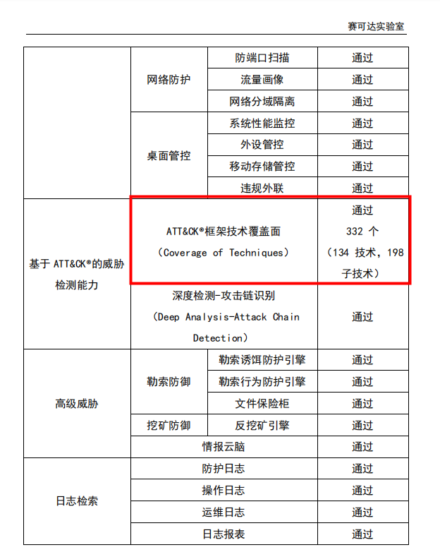 赛可达实验室(SKD Labs)是国际知名第三方网络安全服务提供商,中国合格评定国家认可委员会CNAS认可实验室,也是国际ISO/IEC 17025认证实验室。拥有世界领先的网络安全检测技术、丰富的国际测评经验和专业的测试团队,秉承“公正、中立、科学、严谨”的服务理念,测试采用国内外通用的测试标准体系和技术,强调产品在中国实际网络环境下的性能和功能表现。在本次的测试内容除了涵盖基础的主机安全防护能力之外,还针对性的测评了产品对ATT&CK框架的覆盖程度。(Coverage of Techniques)