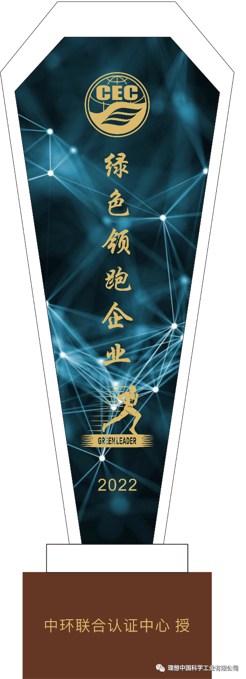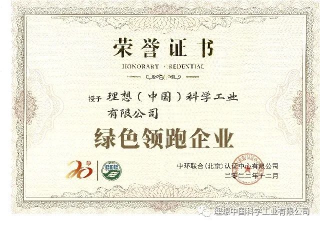 2022年12月,中环联合认证中心在全国各行业5000多家企业中,评选出200家“绿色领跑企业”,理想(中国)科学工业有限公司喜获“绿色领跑企业”荣誉。绿色领跑企业是指以可持续发展为己任,将环境利益以及对环境的管理纳入企业经营管理全过程,并且取得成效,在行业内处于领先地位的企业。