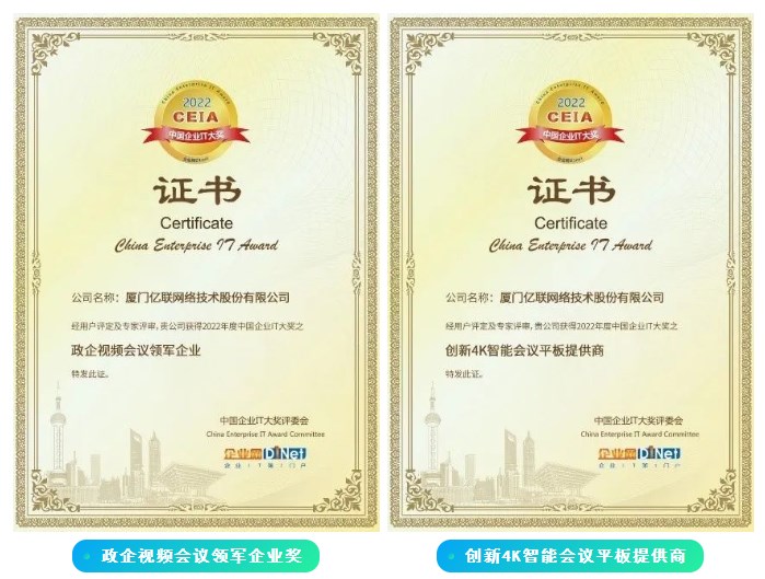 亿联网络凭借提供智慧办公解决方案以及新品音视频会议平板荣获“政企视频会议领军企业奖”及“创新4K智能会议平板提供商”两项大奖。
