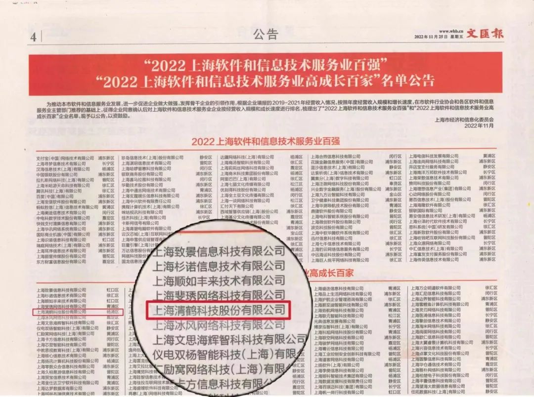 近日,上海市经济与信息化委员会发布了2022年上海软件和信息技术服务业高成长百家名单。上海清鹤科技股份有限公司(简称:清鹤科技)作为专注于操作系统软件研发和企业级视频AI算法的企业成功入选,这是继2020年之后,清鹤科技再次荣膺这项荣誉。