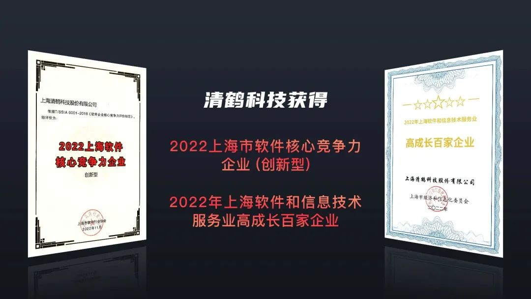 捷报频传。同期,经上海市软件协会T/SSIA 0001-2018《软件企业核心竞争力评价规范》评价,清鹤科技获评2022上海软件核心竞争力企业(创新型)。