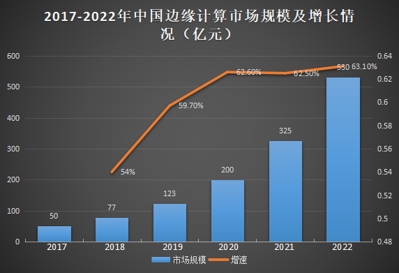 根据工信部数据,2021 年,国内边缘计算市场规模达到 325 亿元,同比增长 62.5%,2022年进一步增至530亿元,同比增长 63.1%,增幅稳步上升。