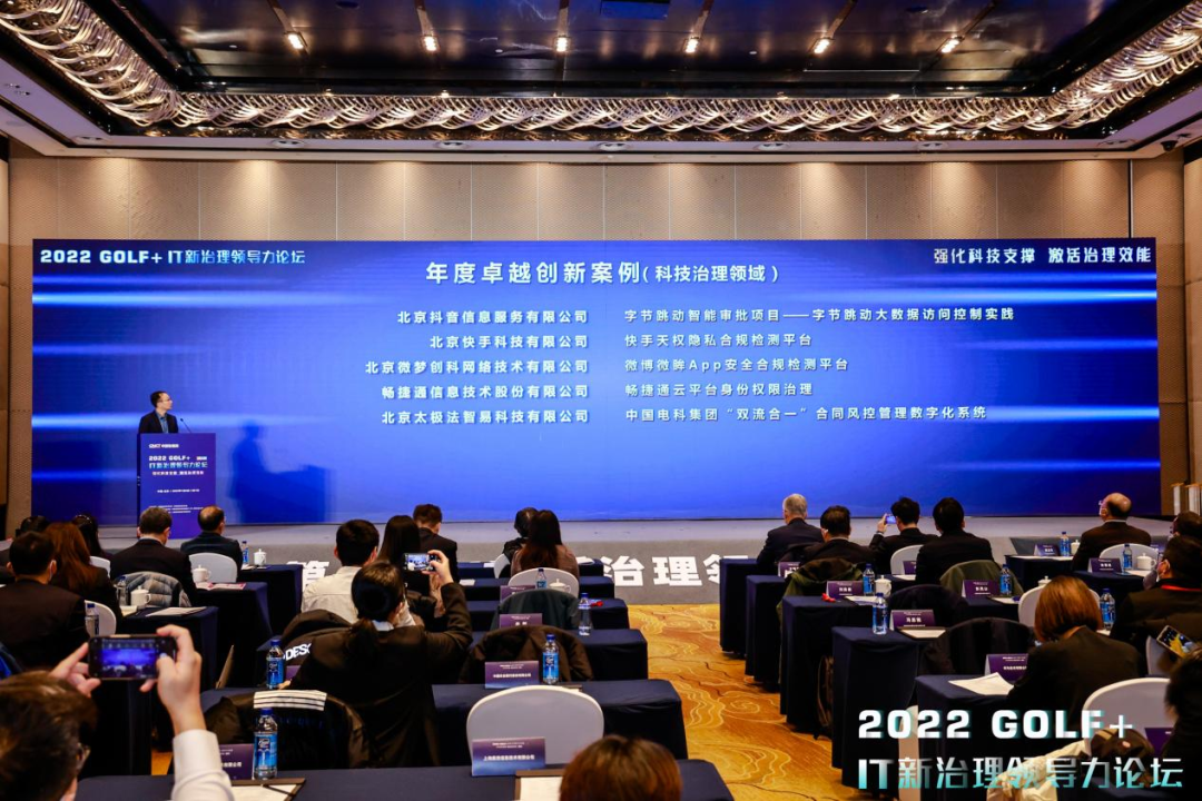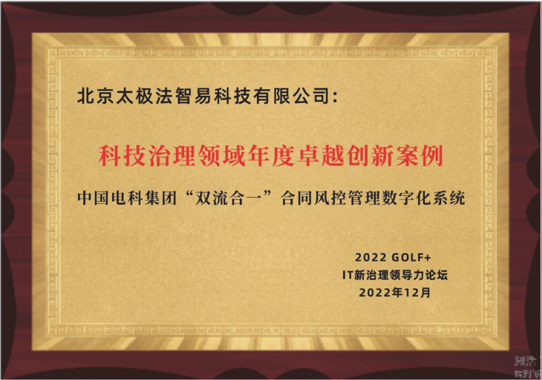 近日,由中国信息通信研究院牵头组织的“2022 GOLF+IT新治理领导力论坛”公布了2022年度 IT新治理领域最新评估结果。其中,太极法智易自研产品——“中国电科集团‘双流合一’合同风控管理数字化系统”受到评审委员会广泛认可,荣获2022 IT新治理“年度卓越创新案例”。