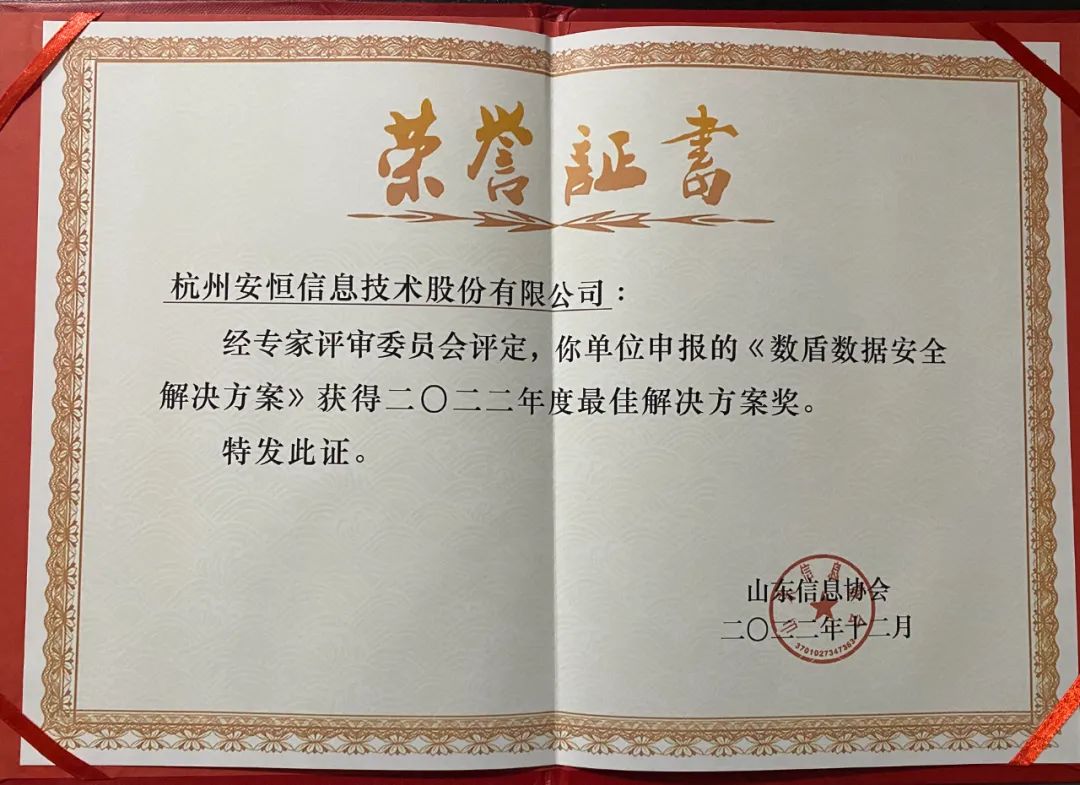 现场,安恒信息被评为最具影响力企业,其《AiThink用户与实体行为分析系统》及《数盾数据安全解决方案》分别荣获2022年山东省网络安全行业最佳产品奖和最佳解决方案奖。
