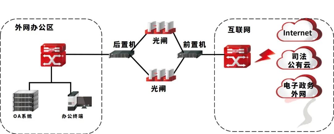 由光闸确保外网办公区与互联网区之间的隔离,前后置机对数据进行采集、推送,整个传输过程均由私有协议封装,同时结合安全数据交换平台的安全引擎,保障狱务公开数据的安全传输,实现减刑假释公示、暂予监外执行公告等业务。