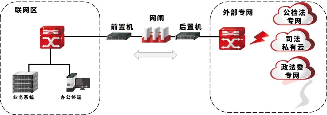 监狱网络系统的联网区负责接入外部专网的边界连接,通过部署前置机、网闸、后置机组成一套安全数据交换平台,在保障联网区与外部专网隔离的条件下,进行各类应用数据的跨网安全交换。
