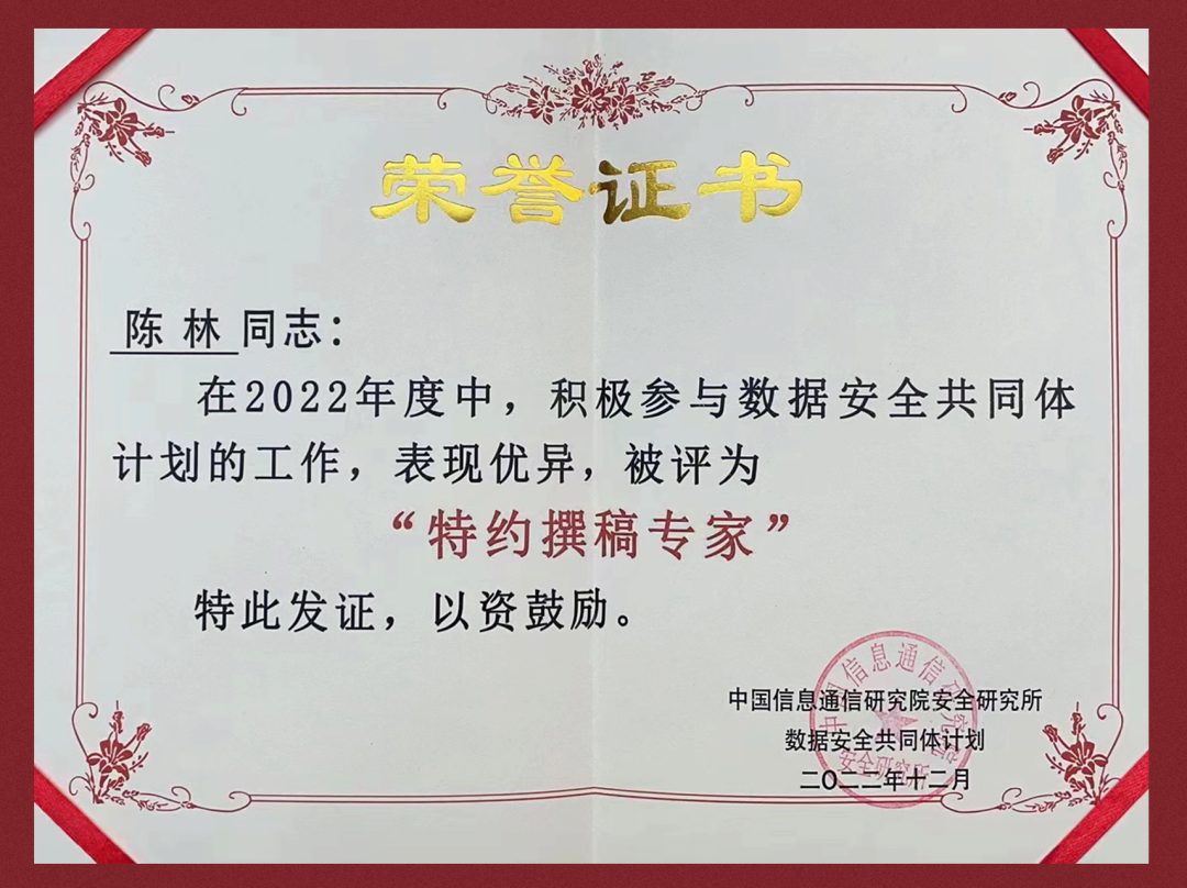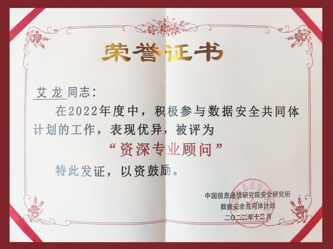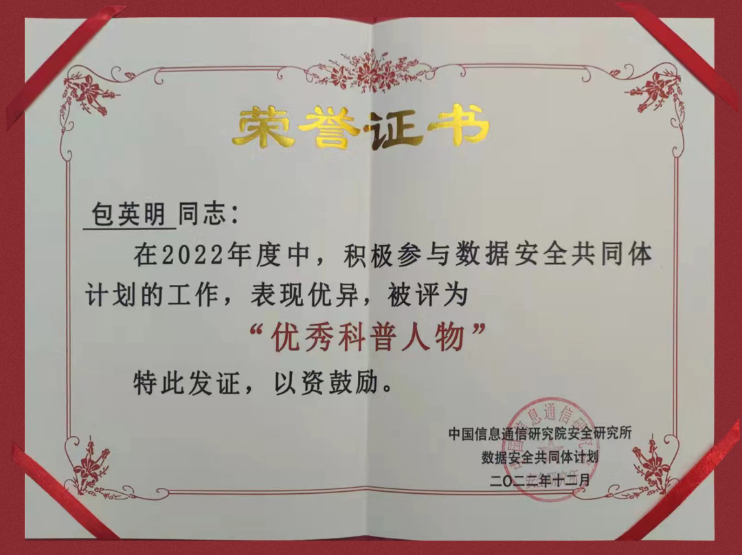 会上,中国信息通信研究院“数据安全共同体计划”2022年度优秀成员单位及优秀个人名单奖项发布。
