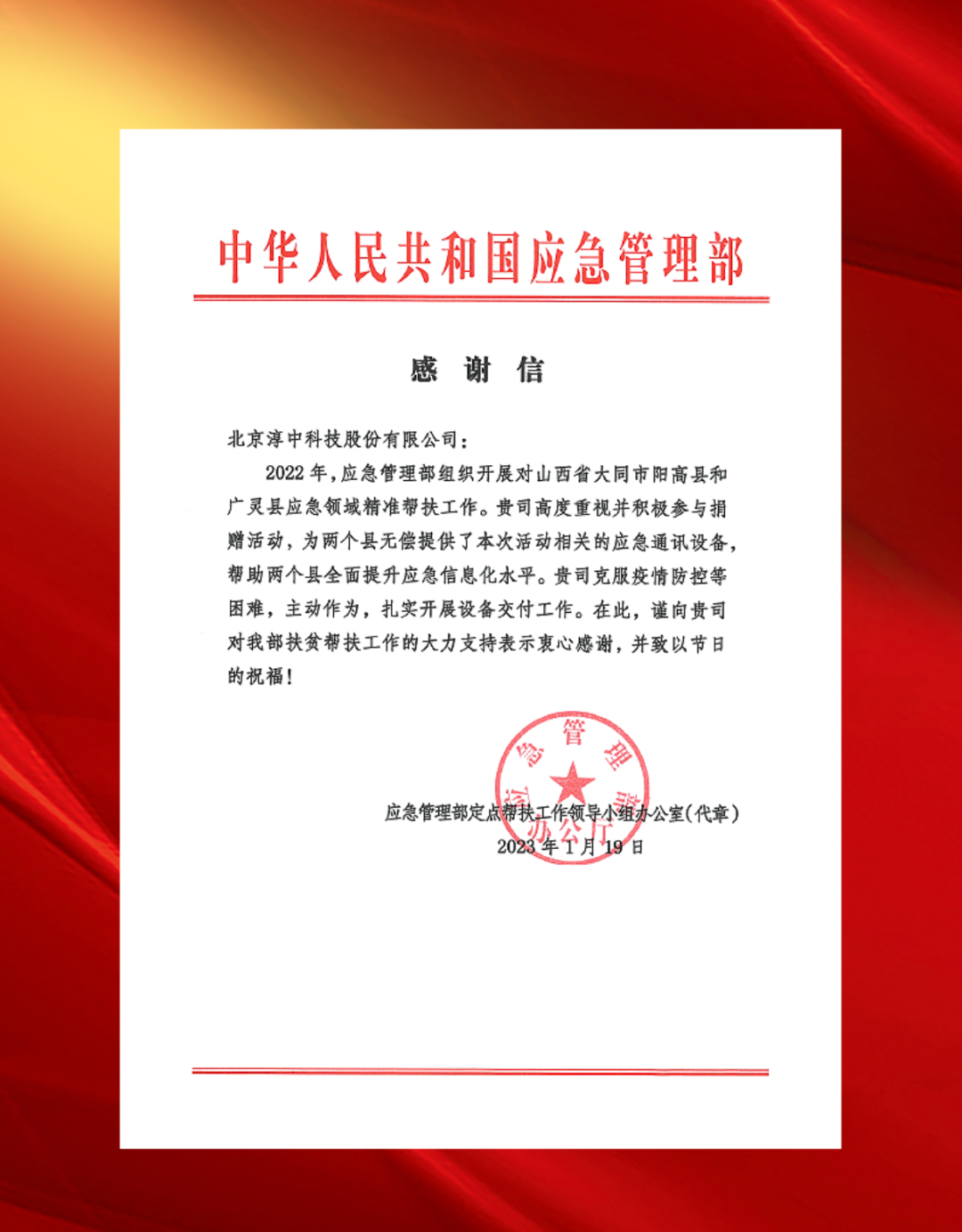2023年春节前夕,淳中科技收到了一封来自国家应急管理部的感谢信。信中对淳中科技在应急管理部定点帮扶工作中给予的支持表示由衷感谢,对淳中主动承担起对口支援任务,促进两县应急管理信息化发展所做出的贡献给予了高度肯定。