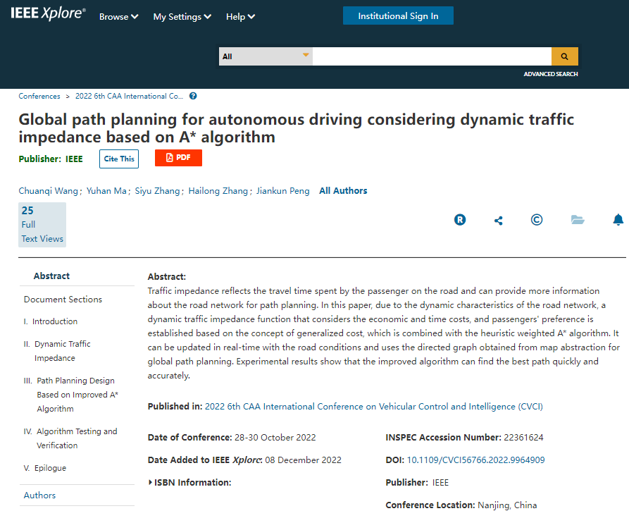 近日,高新兴与东南大学联合组成的研究团队学术成果被IEEE Xplore收录,并被EI核心检索。论文题目为“Global path planning for autonomous driving considering dynamic traffic impedance based on A* algorithm”。第一作者为高新兴智能网联事业部副总经理王传奇。IEEE Xpore平台提供了当今全世界电子电气、通信、计算机科学等领域将近三分之一的文献,代表了全球最新最前沿的研发动态,收录了超过2百万份文献。